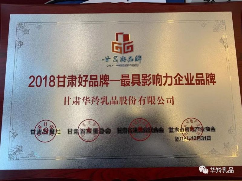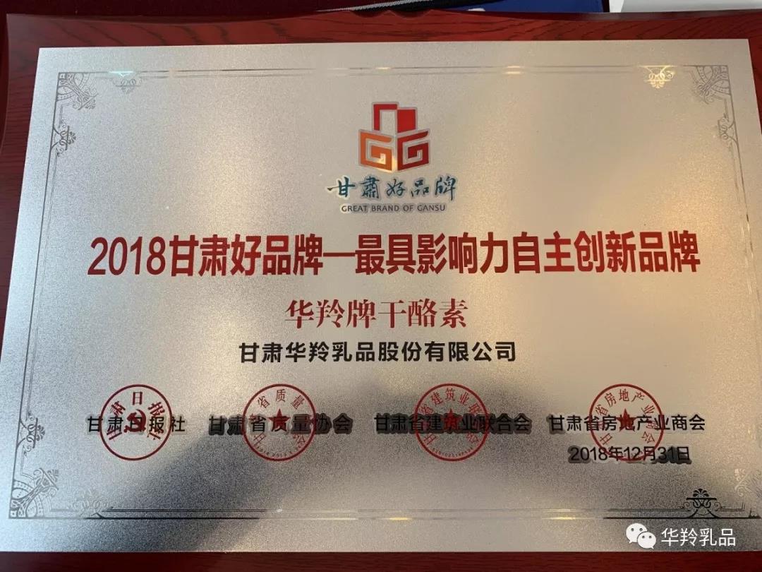 華羚乳品是甘肅好品牌推進計劃入選品牌。在2018甘肅好品牌征集評選中,甘肅華羚乳品股份有限公司榮獲“2018最具影響力企業品牌”和“2018最具影響力自主創新品牌”兩項榮譽。